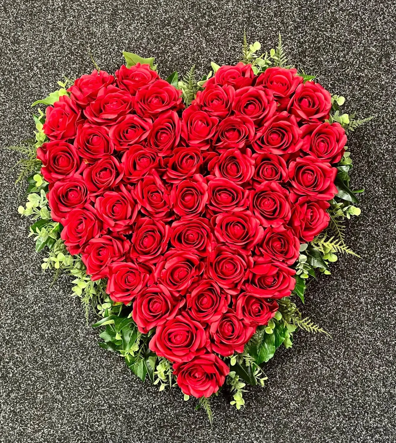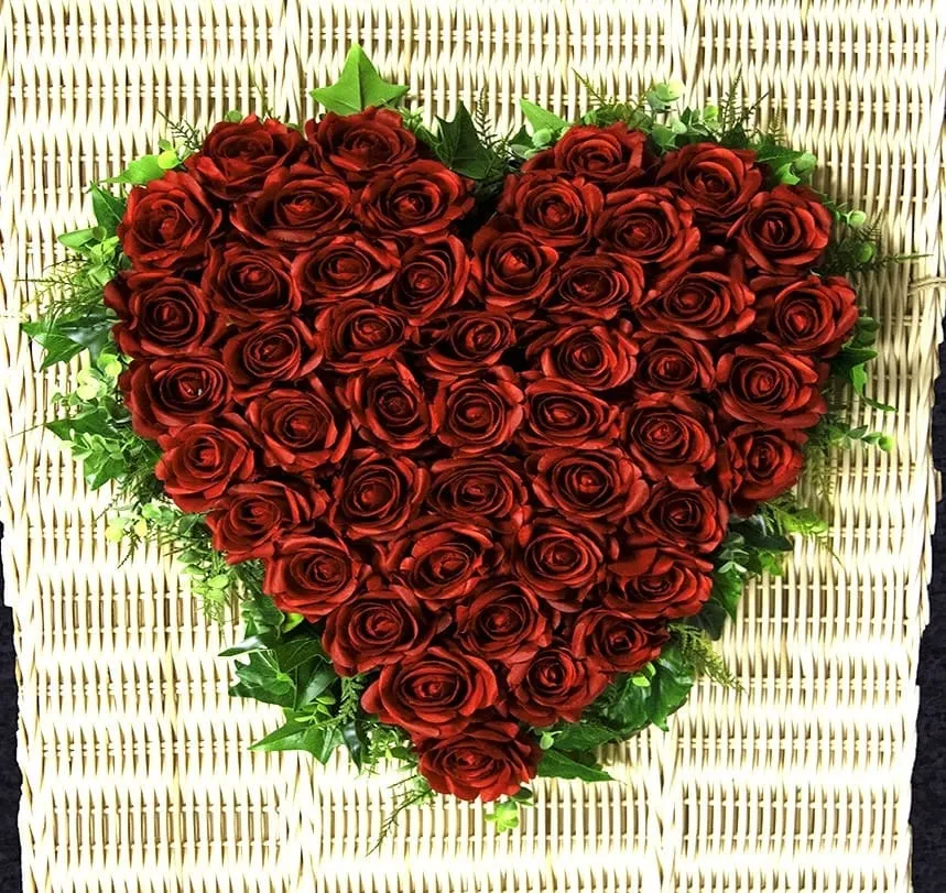 Een tijdloos en liefdevol rouwhart, volledig gestoken met luxe zijden rozen in een diepe rode tint. Dit hart staat symbool voor onvoorwaardelijke liefde en verbondenheid. Door de hoogwaardige materialen blijft het hart perfect in vorm en uitstraling, ideaal voor op de kist, bij de ceremonie of als blijvende herinnering.