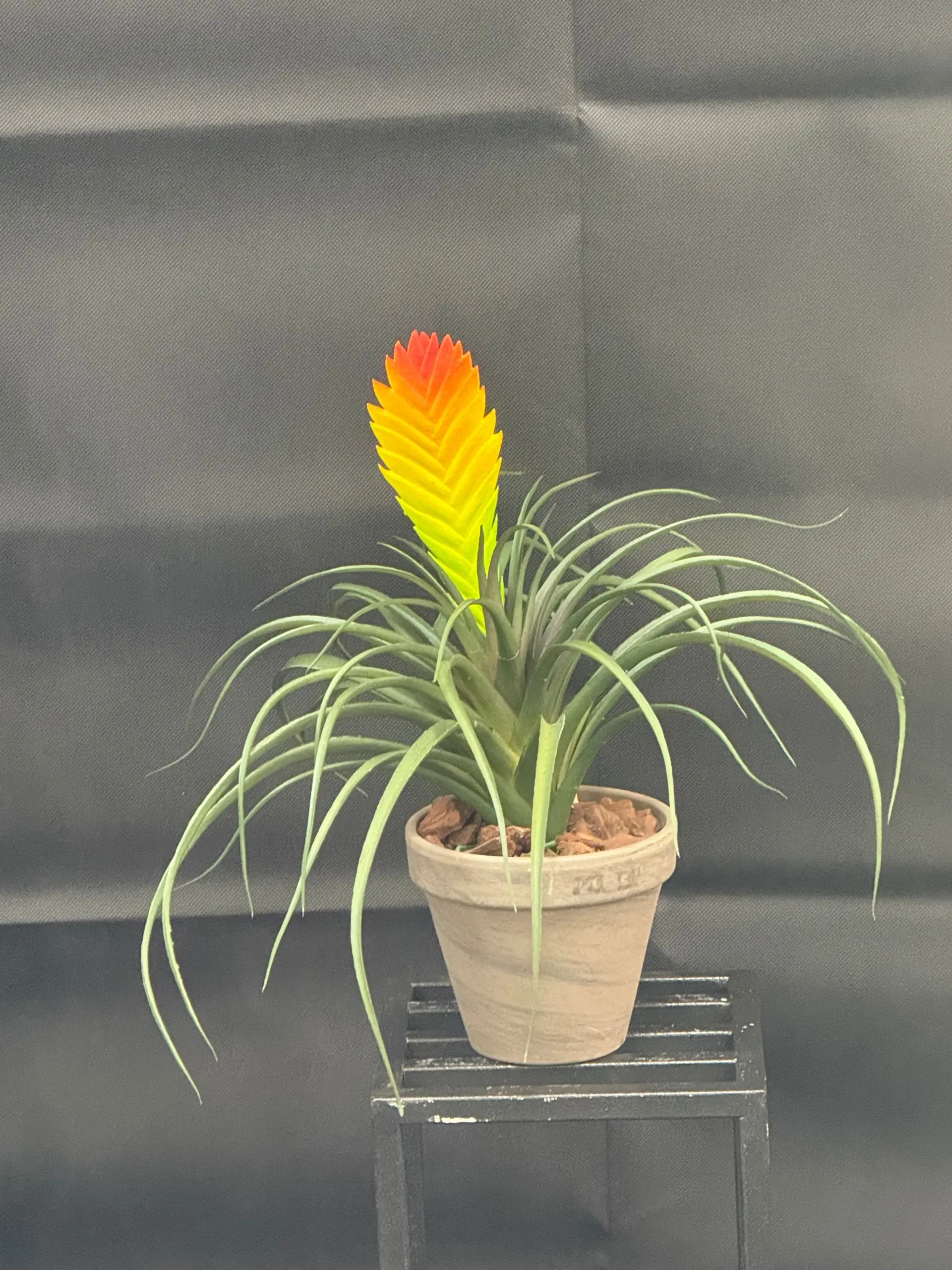 Deze speelse en tropische kunstplant brengt direct kleur en warmte in elke ruimte. De opvallende bloemaar – van felgeel tot diep oranje – is typerend voor de Vriesea, een populaire bromelia-soort. De lange, smalle bladeren met natuurlijke sierlijke krul geven de plant een levendig en exotisch karakter.