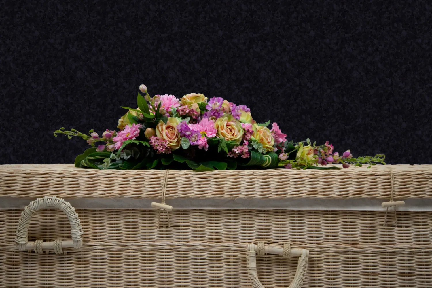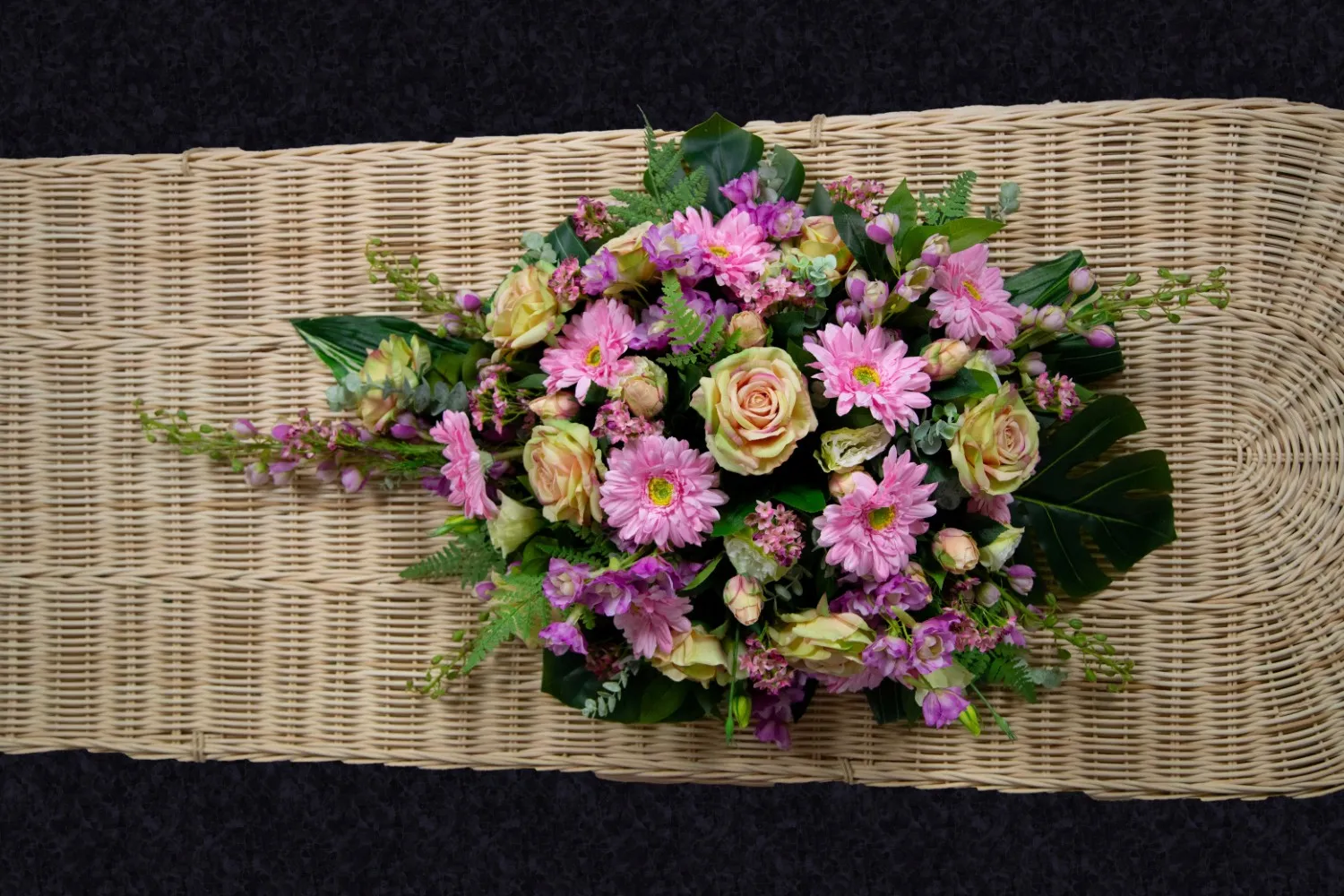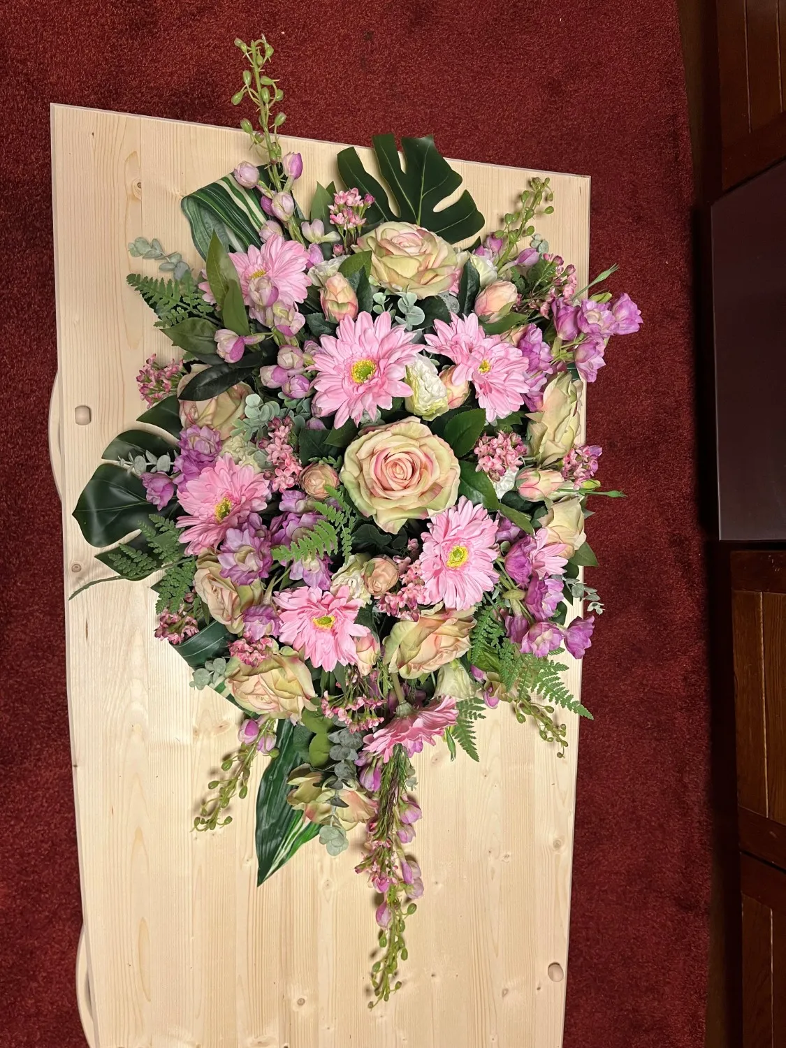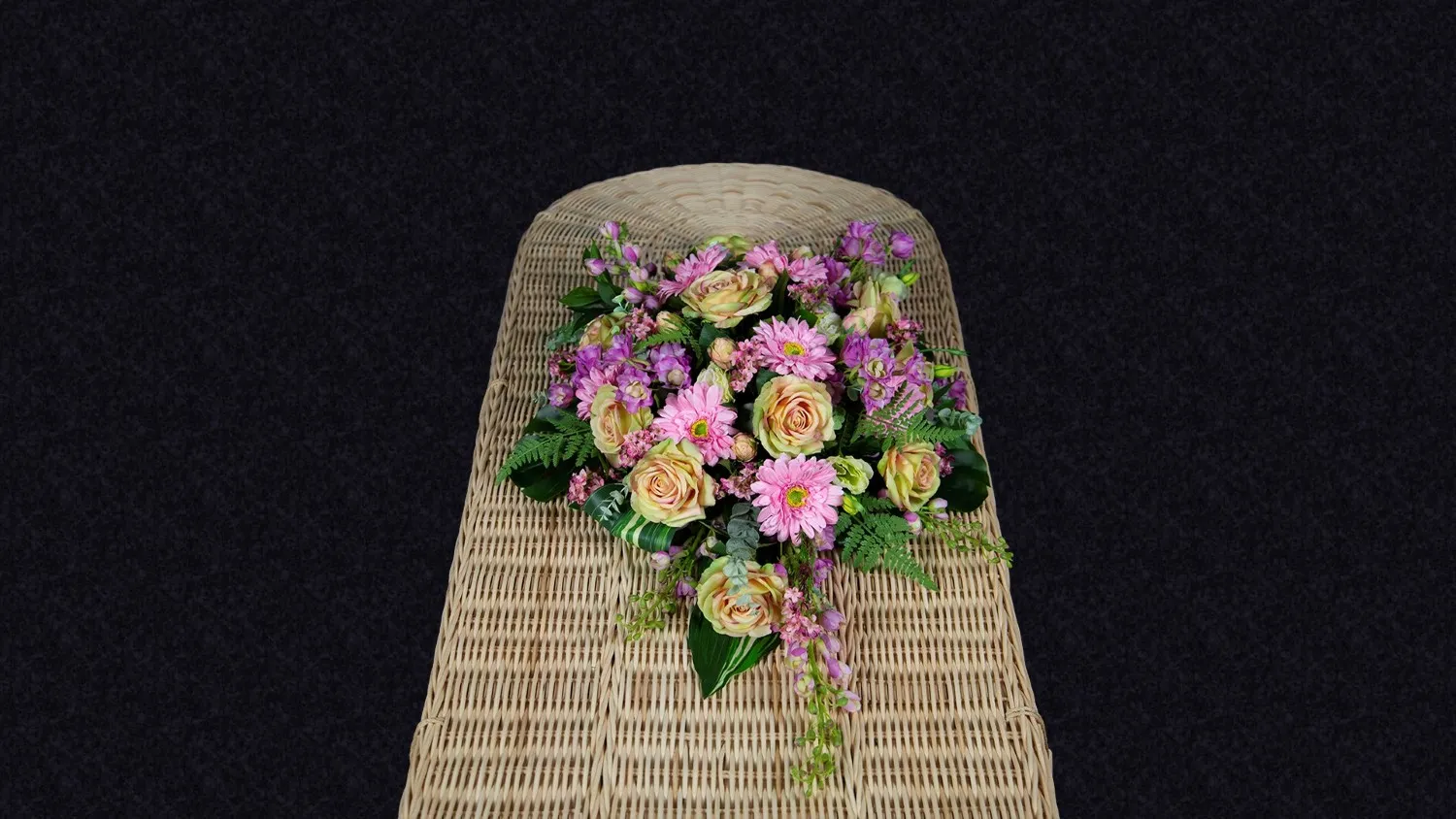 Een verfijnd rouwstuk in zachte roze en pastelgroene tinten, gevuld met luxe zijden rozen, gerbera’s en fijne bloesems. Dit arrangement ademt zachtheid, liefde en tederheid. De hoogwaardige zijden bloemen blijven prachtig en vormvast, waardoor het ideaal is voor op de kist of bij een intieme ceremonie.