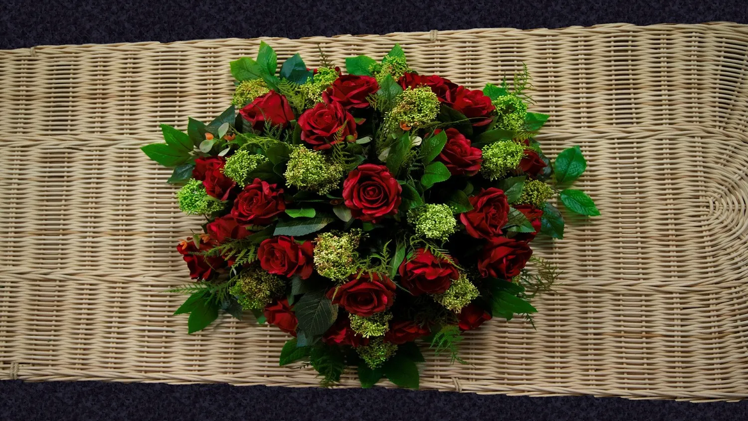 Een stijlvol, compact rouwarrangement met diep rode zijden rozen en frisgroene accenten. Dit klassieke stuk staat symbool voor liefde, respect en onverwoestbare verbondenheid. Dankzij de hoogwaardige zijden bloemen blijft het arrangement perfect van vorm en kleur, ideaal voor op de kist of bij een intieme ceremonie.